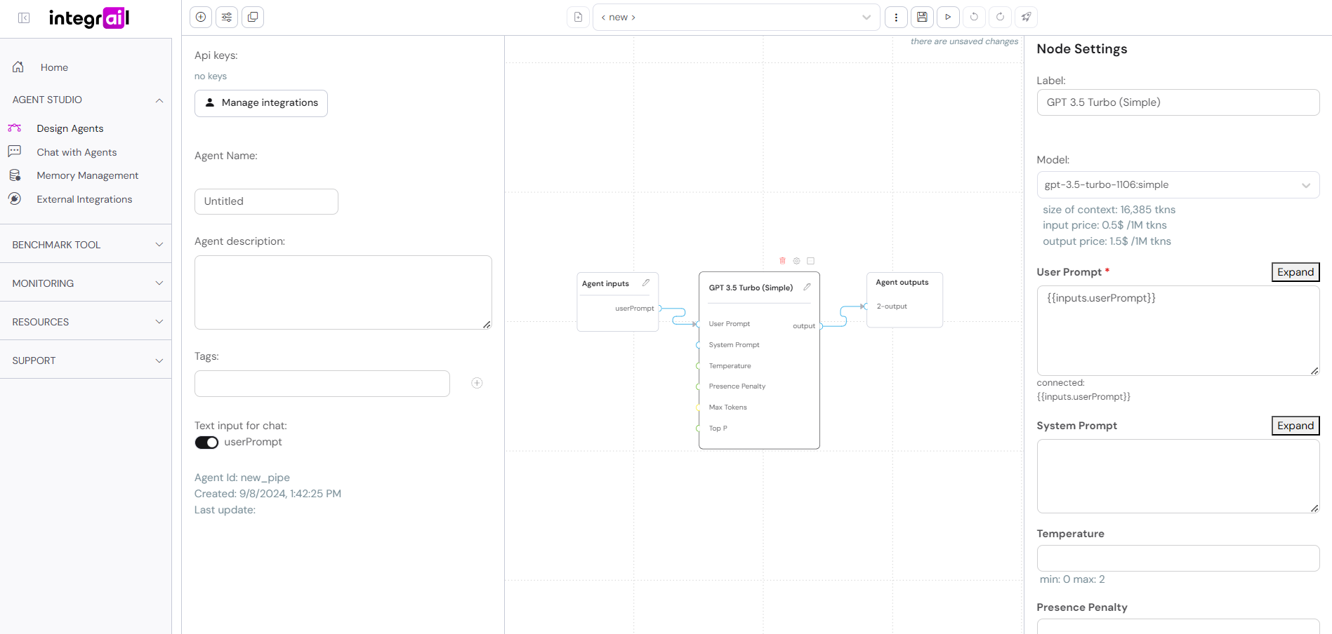 The **Integrail platform's core** is the agent-based workflow, known as an AI pipeline. To create a new workflow, go to the "Agents" section and click "New Agent" at the top left to start building a new AI flow that automates your tasks and processes.