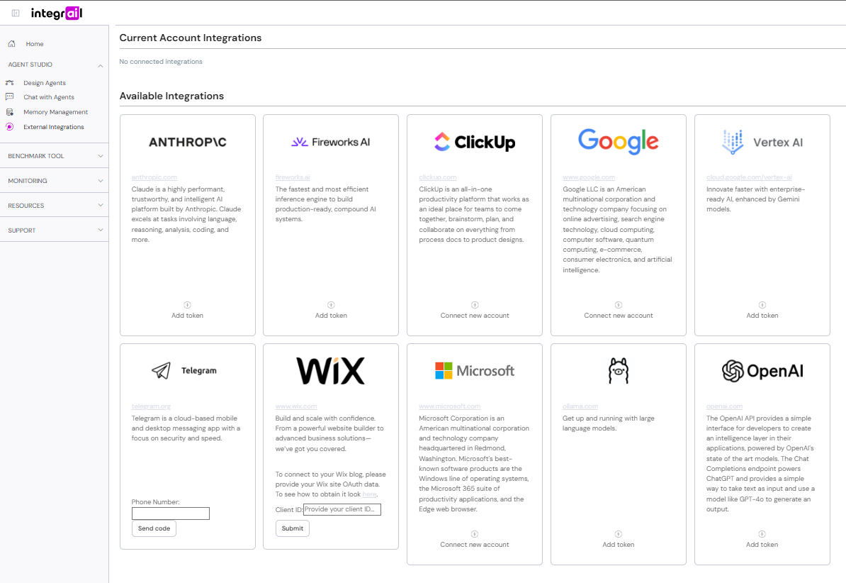 Integrail agents can seamlessly integrate with popular platforms such as **OpenAI, Anthropic, OLLAMA, Google Vertex, Fireworks, Google, Microsoft, Telegram, ClickUp, and WIX** to automate workflows, manage data, and enhance productivity across your existing tools and services.